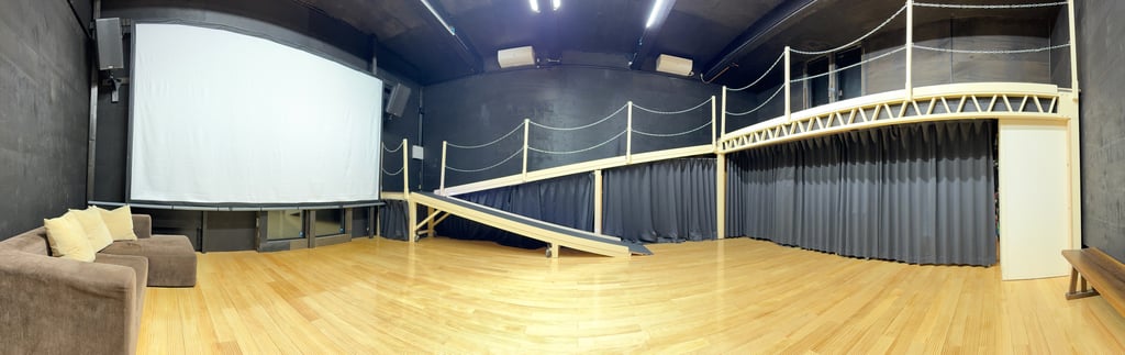 The 1.82 meter by 7 meter stage can be used as a stage (of course), a spot to shoot video from above or a control room for video, audio and lighting control for live events. The small 0.9 meter by 1.7 meter stage in the corner is a great place for a presenter to stand during presentations and seminars. The lower slope can be moved under the upper slope for more floor space.