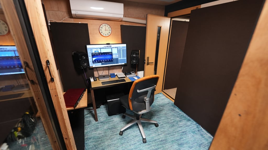 Studio J is a stand alone recording studio built in a shipping container that can be rented alone or with the other spaces. The recording room (2.9m (d) x 2.1m (w) x 1.9m (h)) and control room (2.2m (d) x 2m (w) x 2m (h)) have been acoustically treated to be silent and free of reflections for clean and realistic recordings. It's also a great place for songwriting, telework or small meetings.