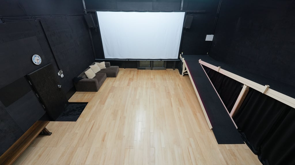 The giant 200" screen turns the Mail Hall into a movie theater for movie screenings or just to enjoy some movies with Friends. It can also be used for presentations and seminars for larger groups of people. Two QSC K12.2 active loudspeakers are mounted on the walls for excellent sound for movies as well as live music. These speakers can be moved to the stage area if you are performing from the stage.